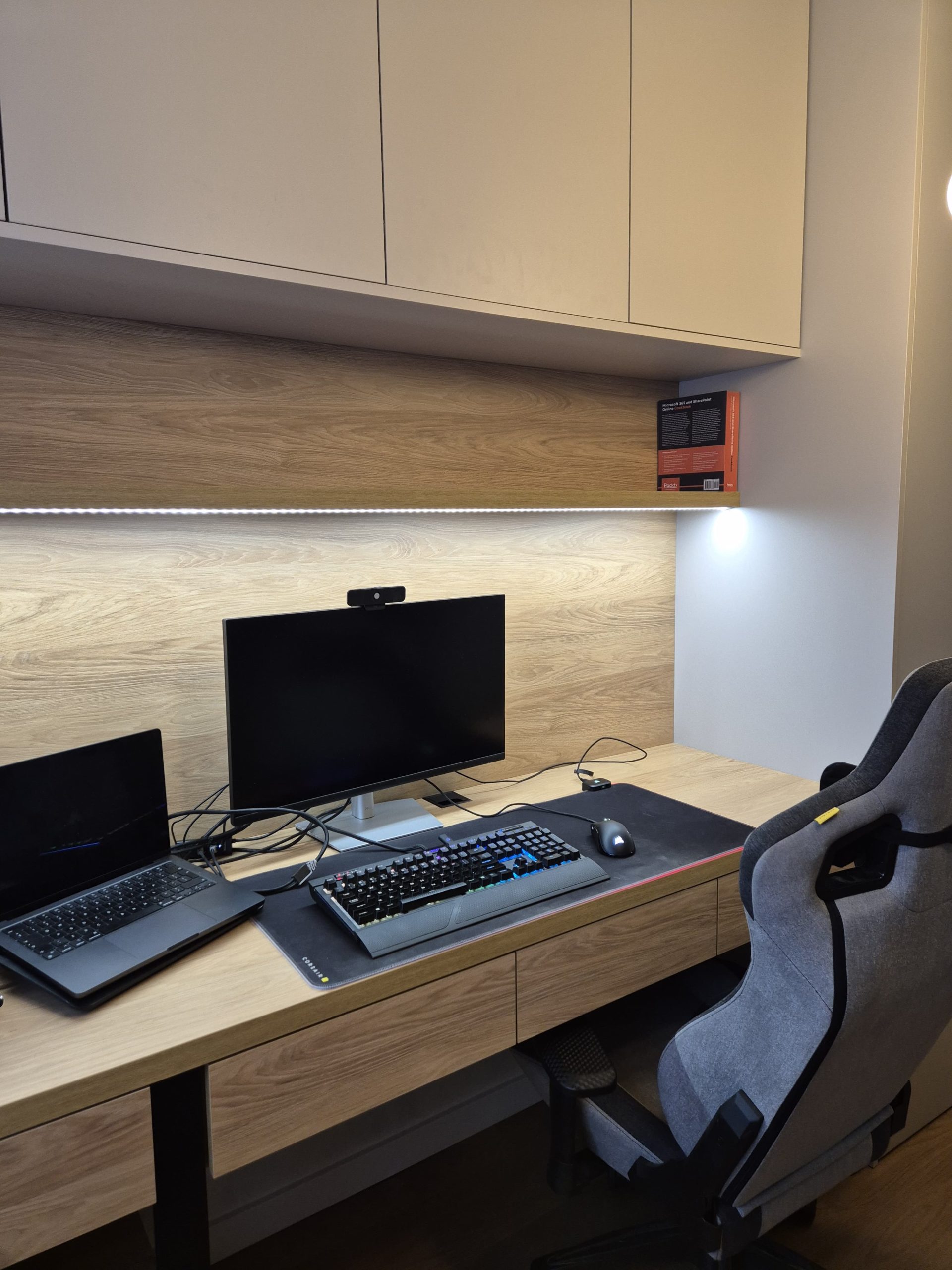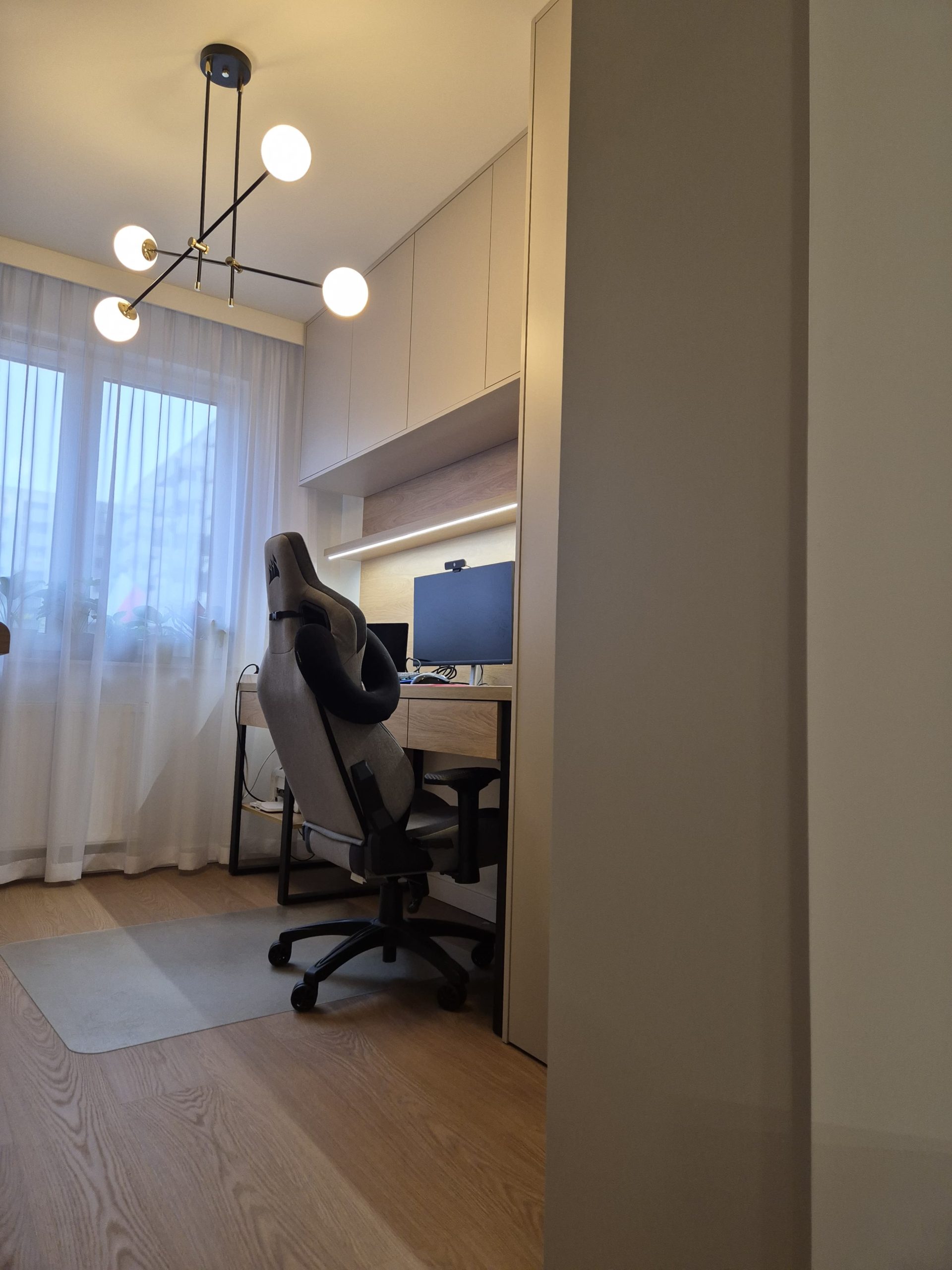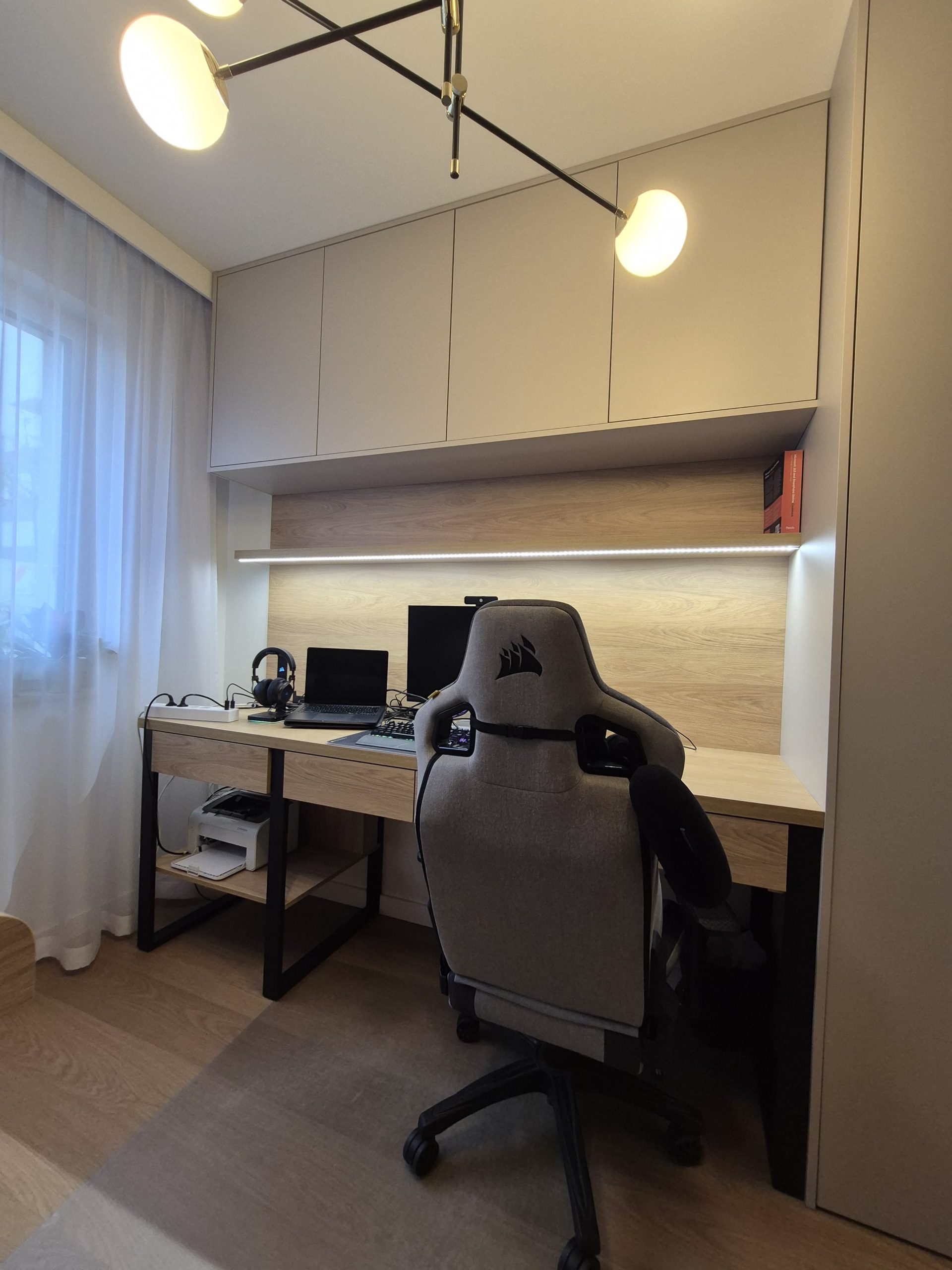 W czasach home office bardzo popularne w projektach stają się domowe biura. osobne pomieszczenie przeznaczone do pracy. Jego najważniejszym elementem wyposażenia jest duże, praktyczne biurko i odpowiedni fotel. Resztę przestrzeni najczęściej wykorzystuje się jako dodatkową powierzchnie do przechowywania.