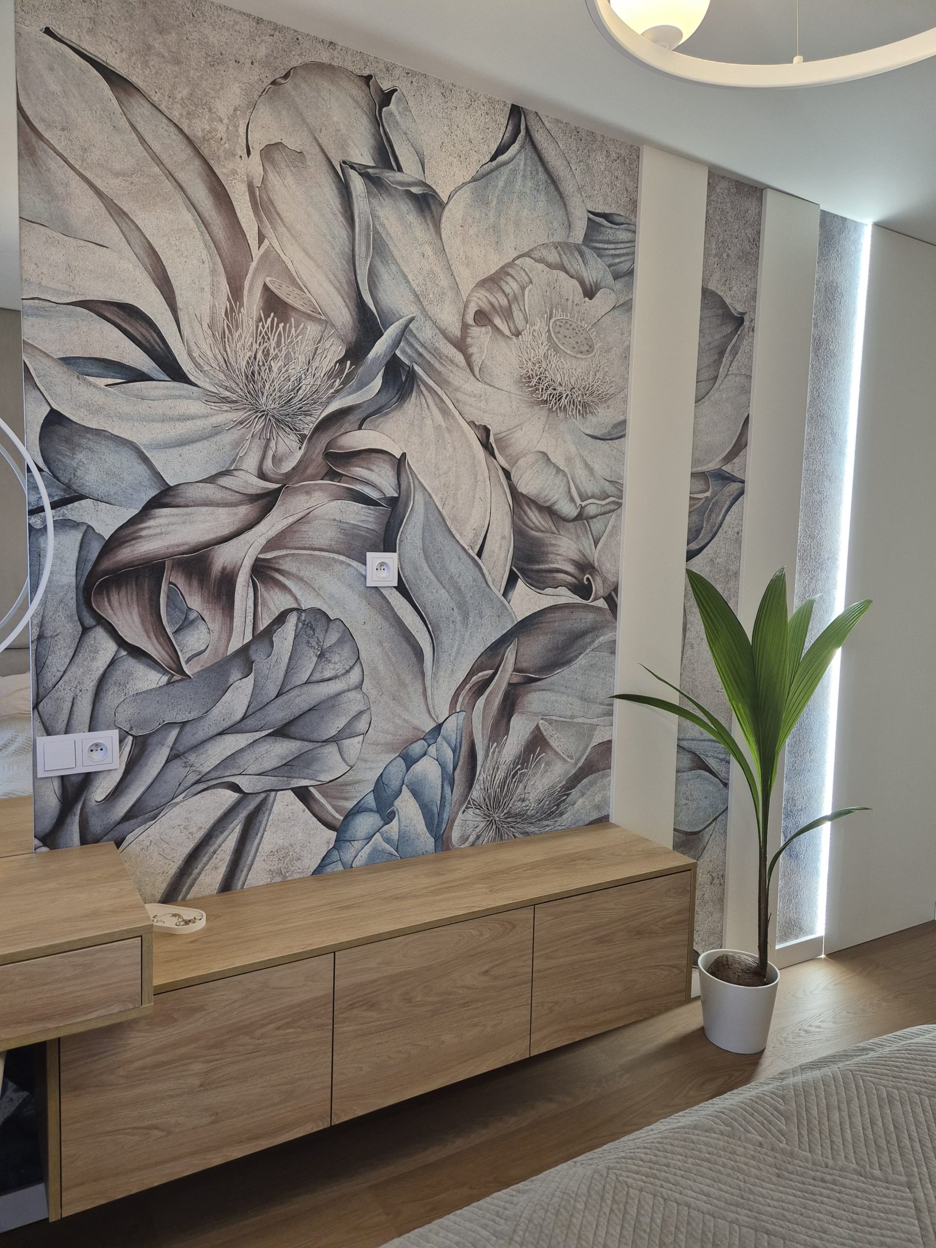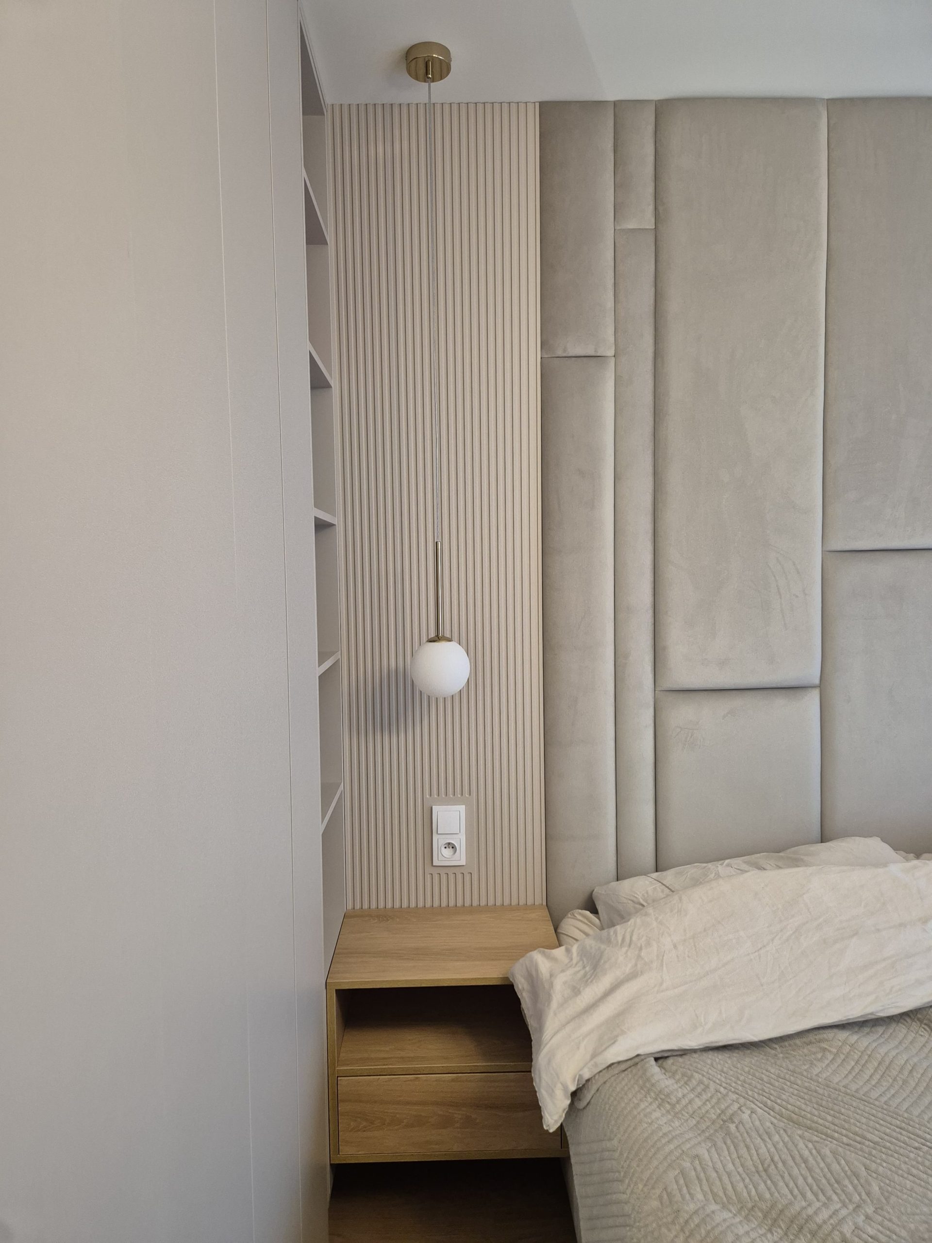 Sypialnia wykonana została również w beżowych, jasnych kolorach, z tapicerowanym zagłówkiem, frezowanymi panelami, ledem na ścianie i piekną tapetą.