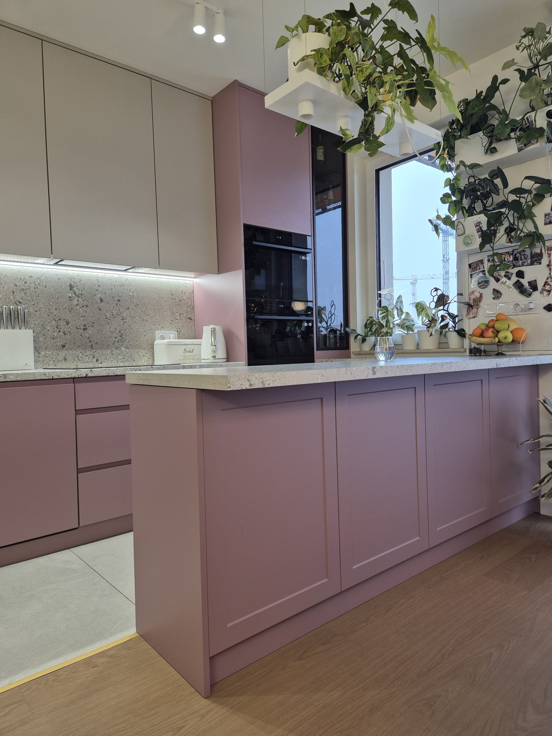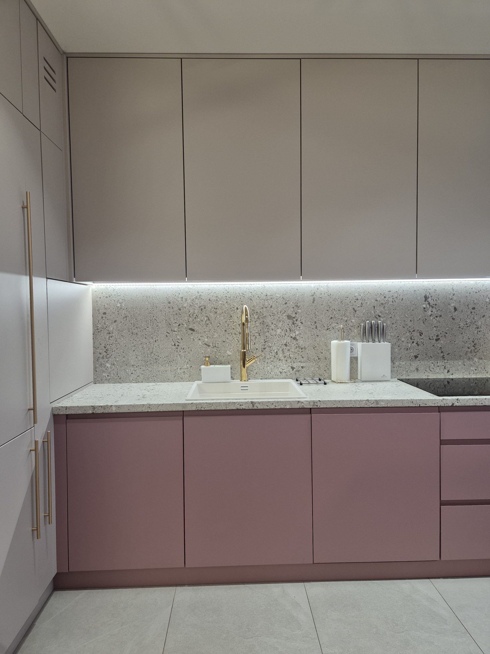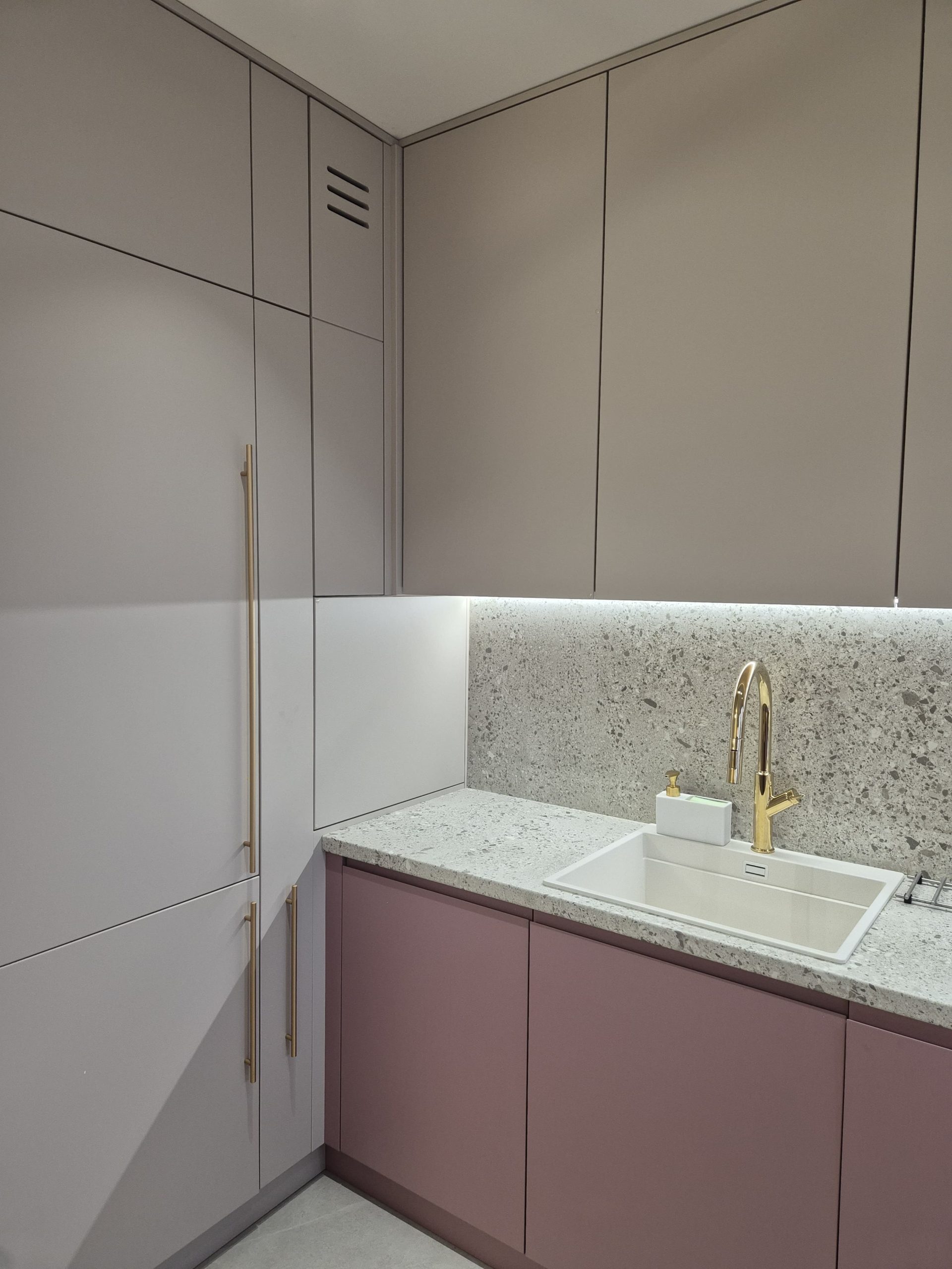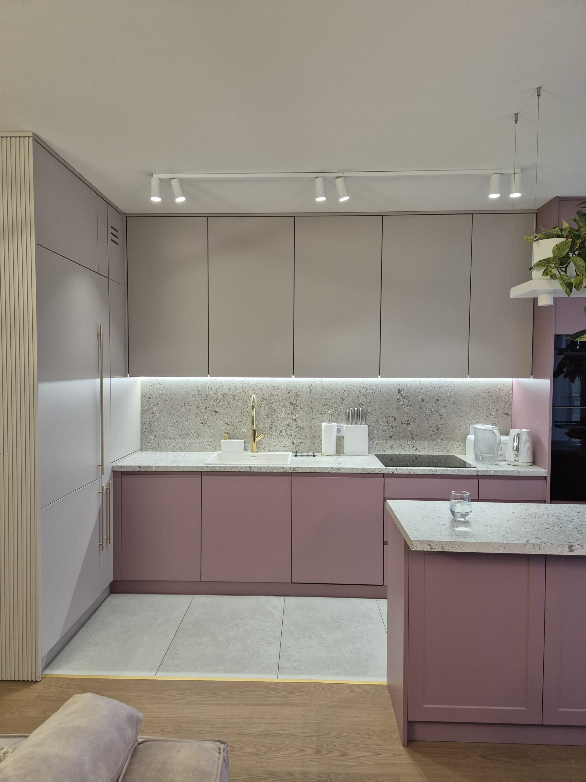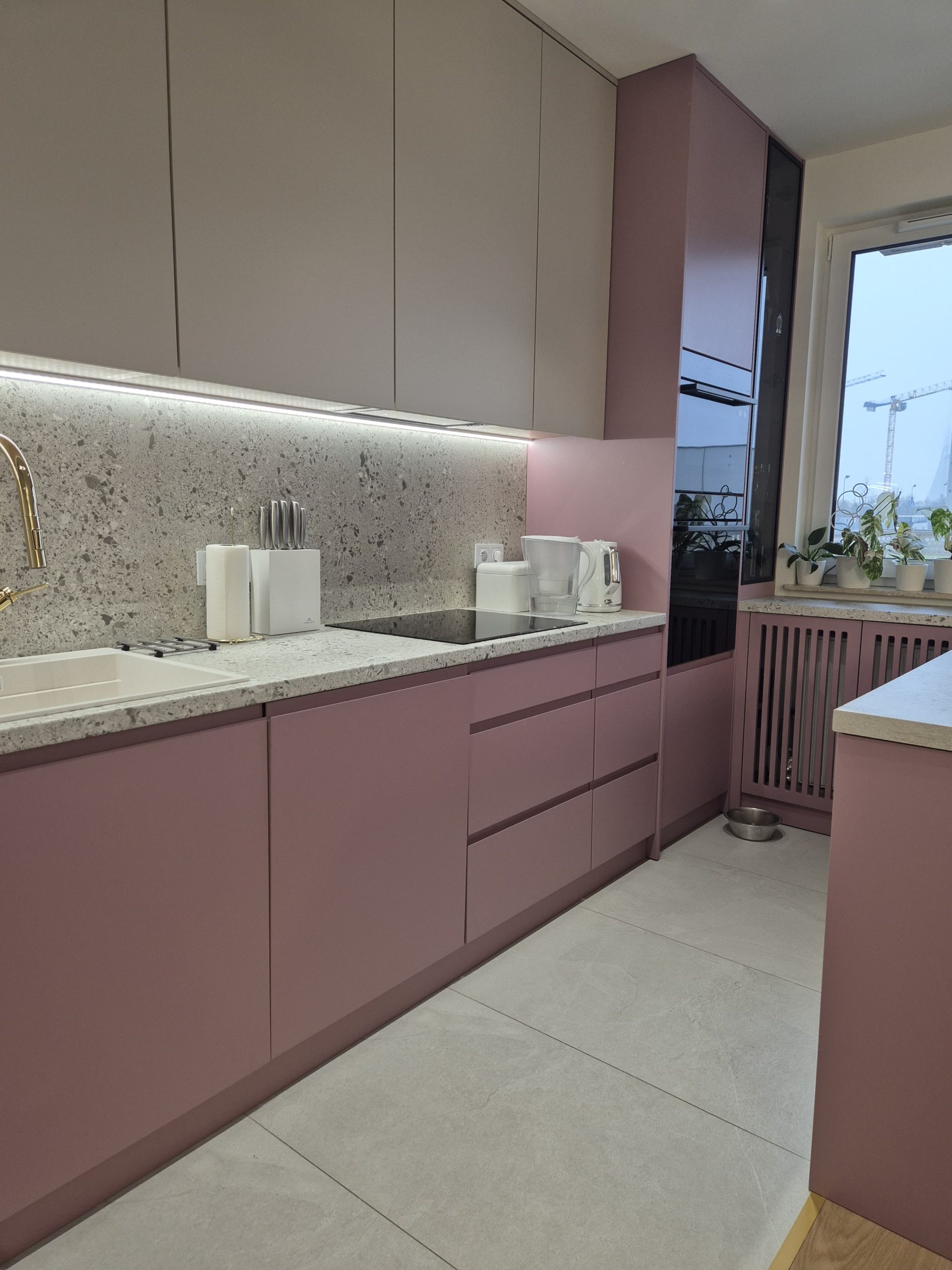 Kuchnia wykonana została w kolorach beżu i pudrowego różu. Fronty lakierujemy dwustronnie, w tym przypadku farba jest matowa, z dodatkiem który powoduje, że na frontach nie zostają ślady po palcach. Blat w tym wypadku to laminat dobrany z wzornika. Dostępne są również blaty kamienne, hpl i inne. Zastosowaliśmy uchwyty w złotym kolorze, dobrane razem z klientką.