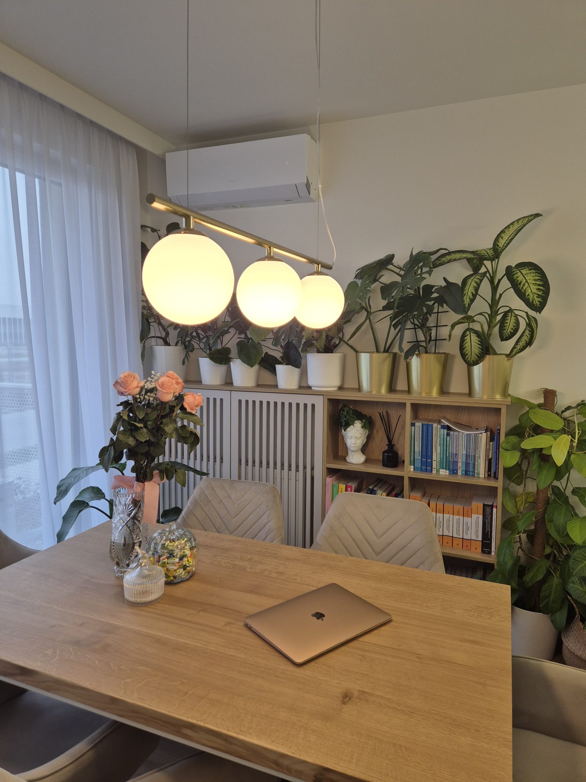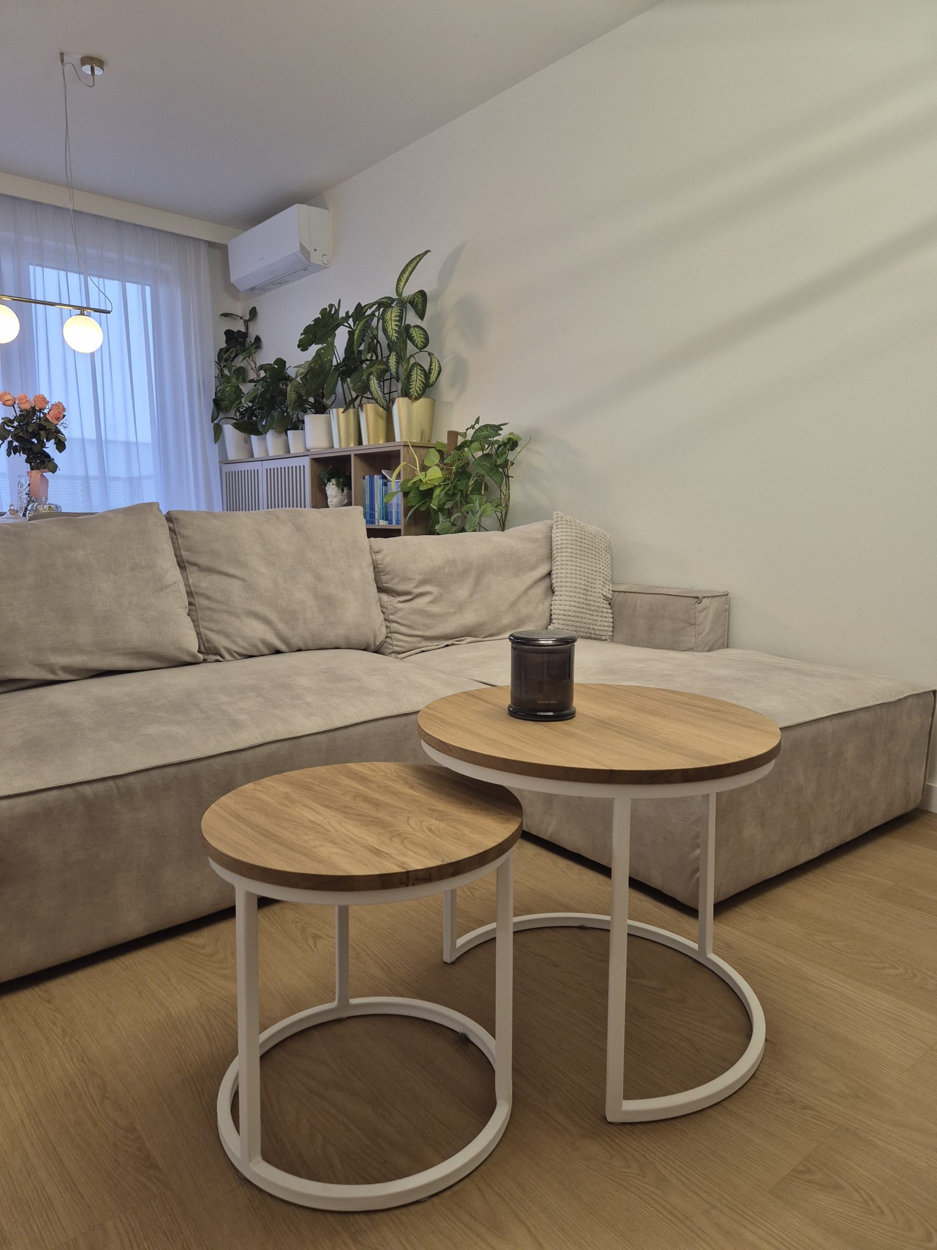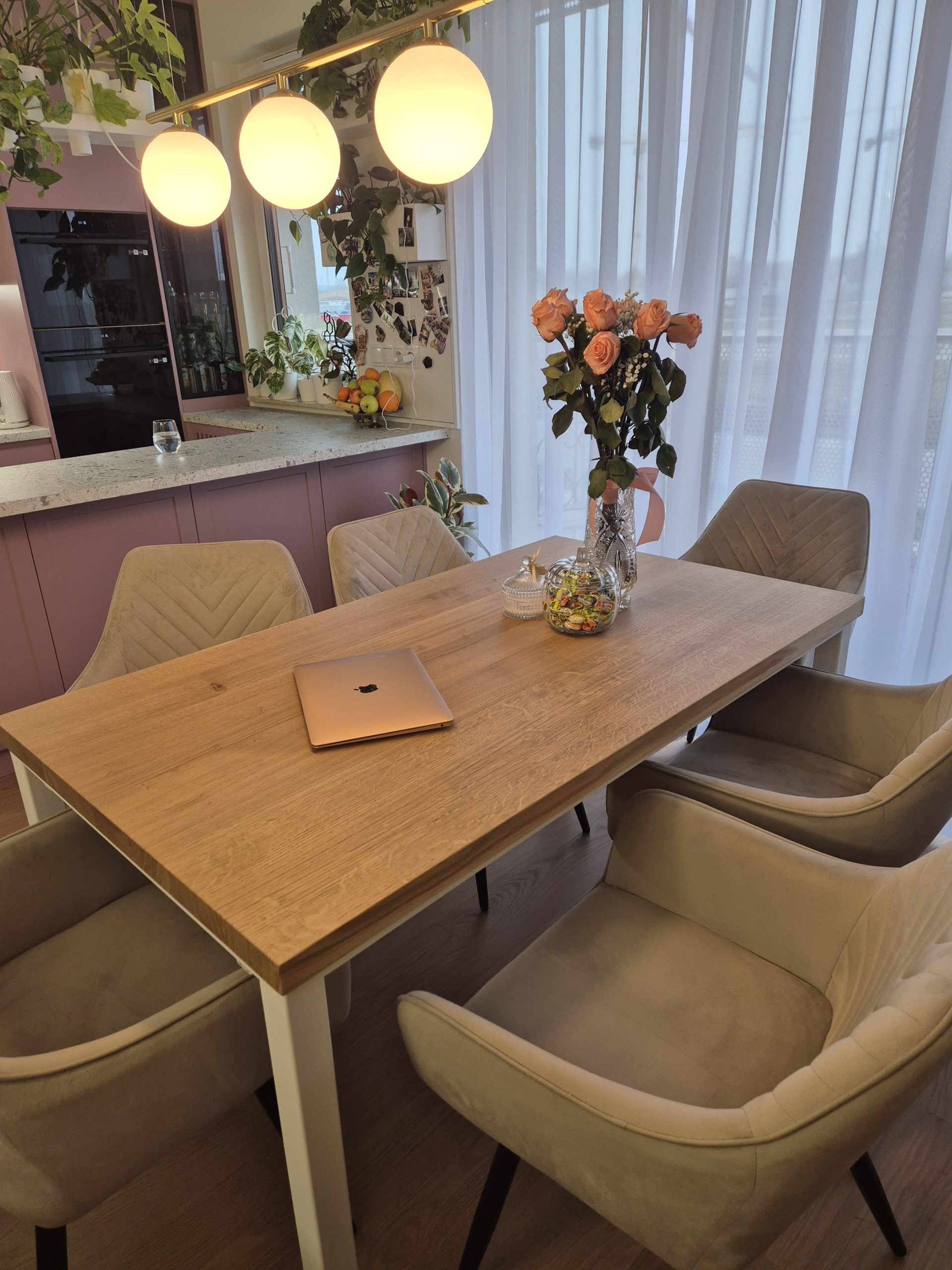 Całość dopełniają stół i zestaw stolików z dębowymi blatami na stalowych, białych podstawach. Stół może się powiększać dzięki zastosowaniu dodatkowych dostawek.
