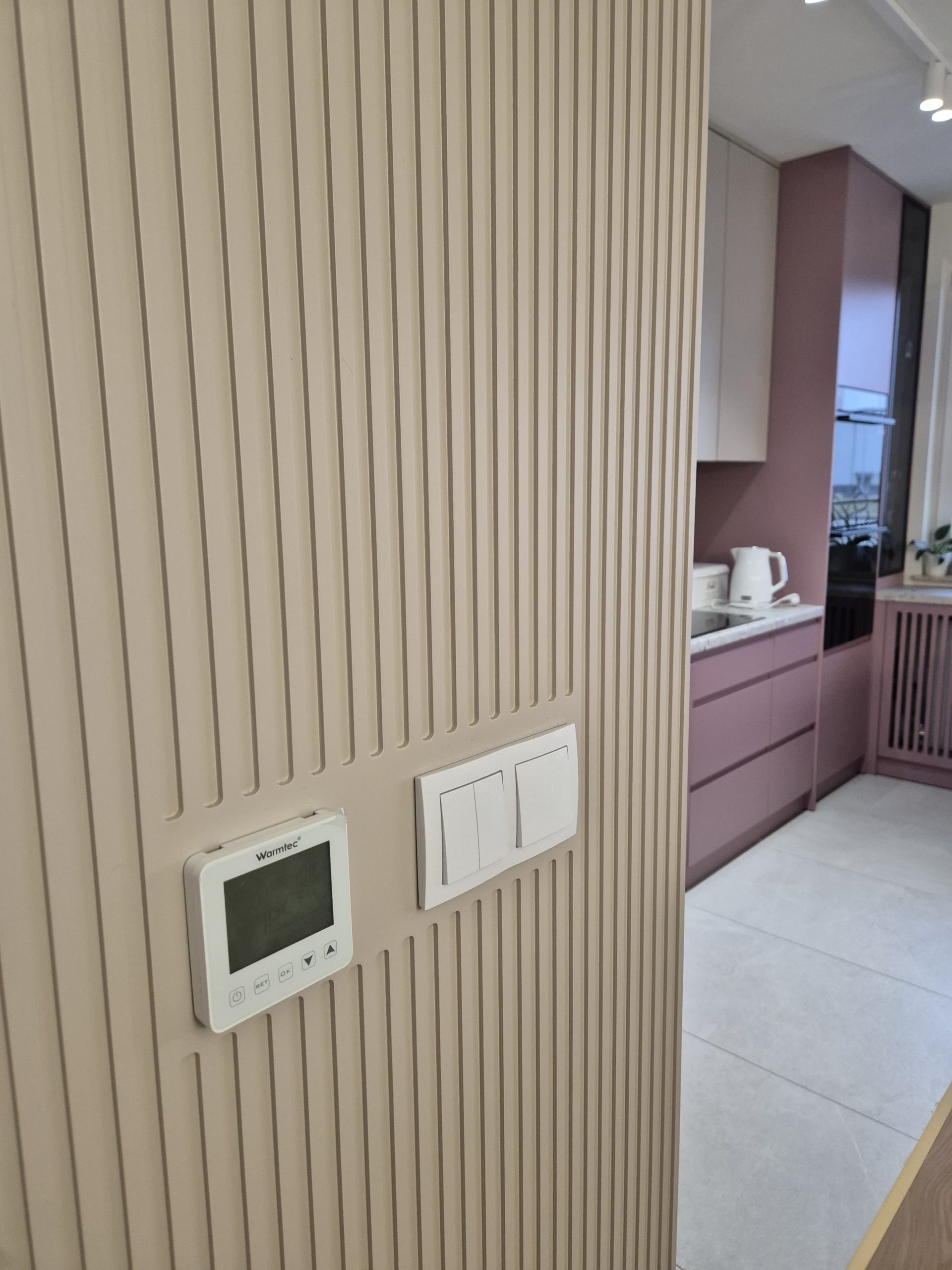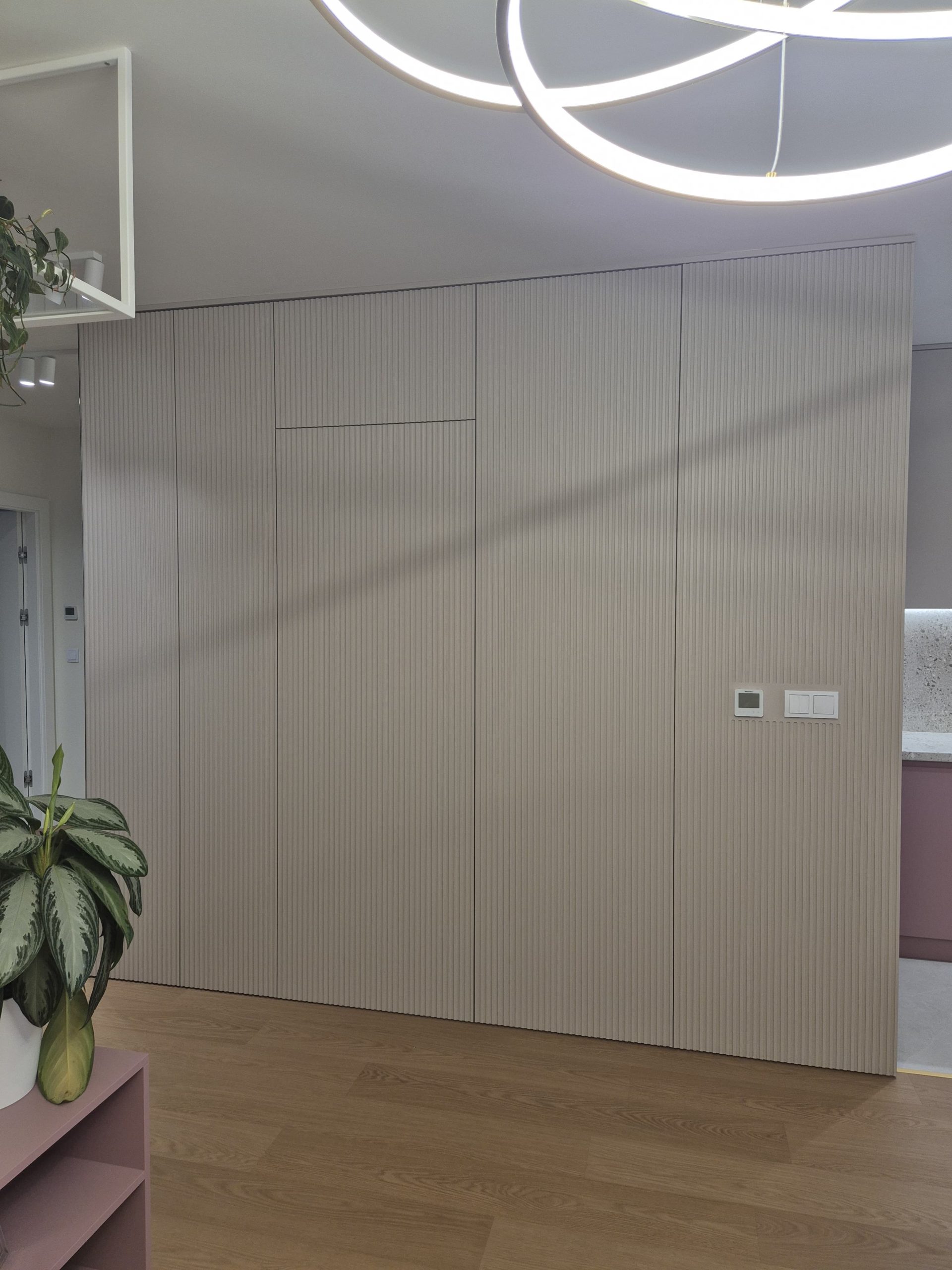 na ścianie w przejściu z salonu do kuchni ukryta jest szafa za ryflowanymi frontami. Mają długość niemal od podłogi do sufitu dzięki temu niektórzy nawet nie zauważają, że ukrywają przejście do spiżarni!