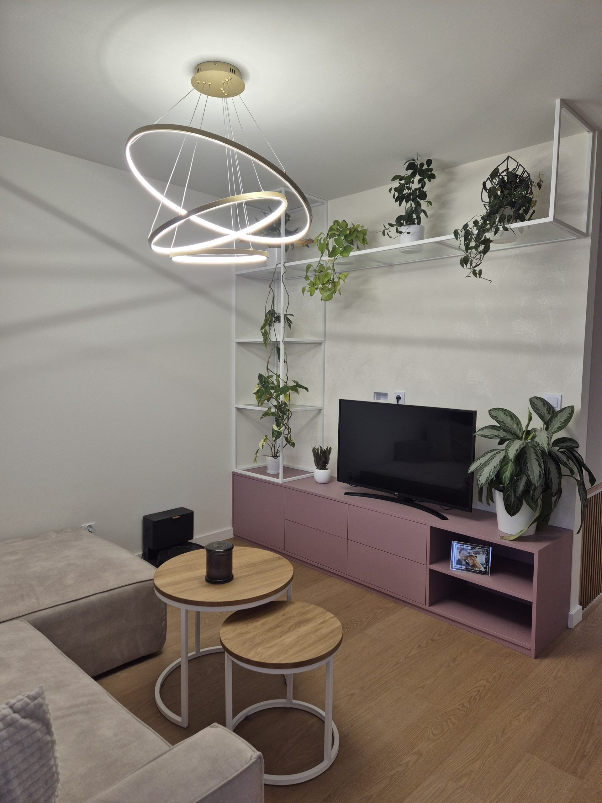 Jednym z ciekawszych rozwiązań jest na przykład kwietnik nad telewizorem wykonany ze stali pomalowanej na biało i szkła. Jest lekki wizualnie i stanowi piękną podstawę dla roślin.