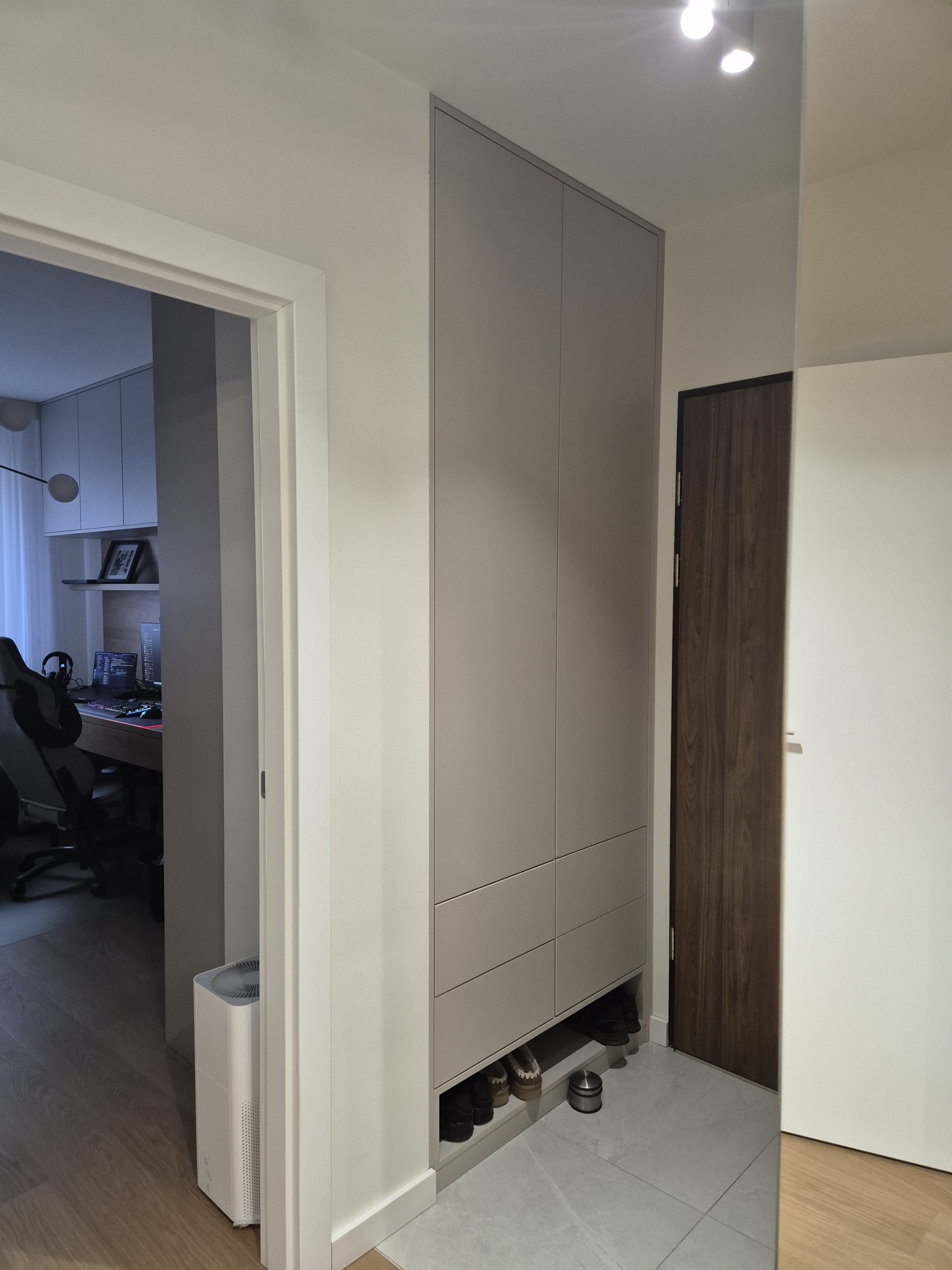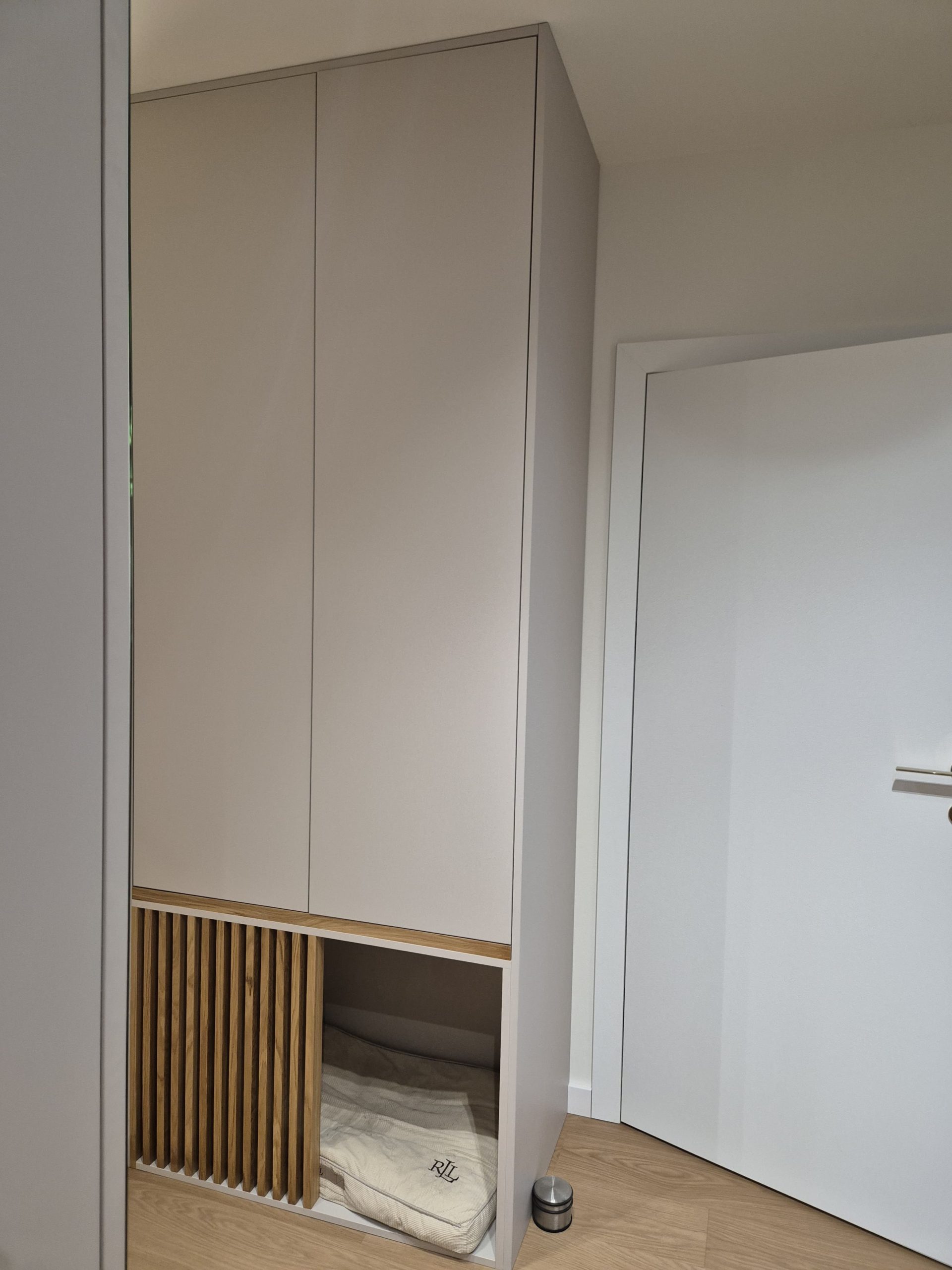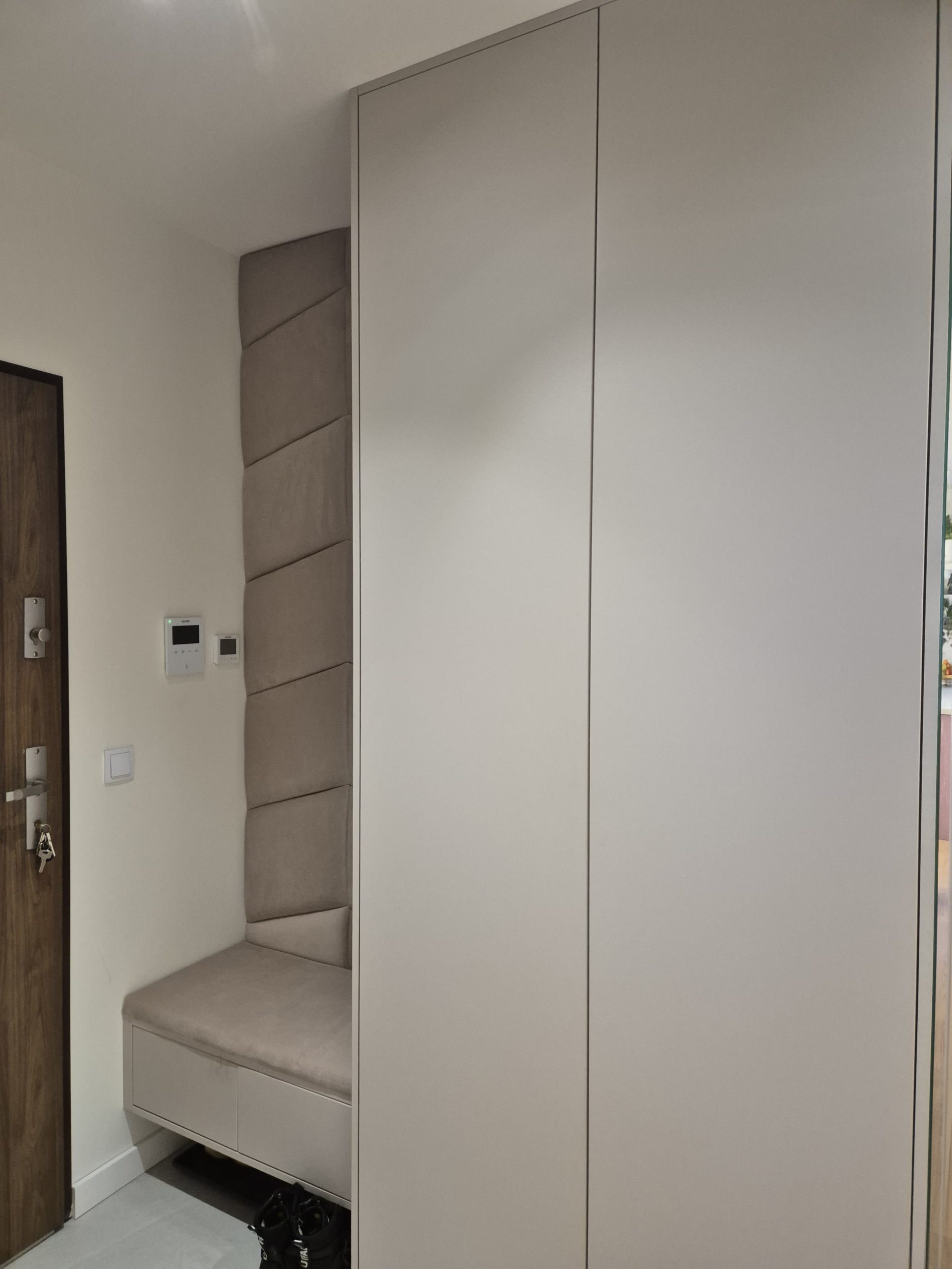 Szafy w przedpokoju pomieszczą dużo ubrać i skarbów. Przy samych drzwiach wykonaliśmy tapicerowane siedzisko. Na dole jednej z szaf znajduje się legowisko dla psa, które od razu pokochał!