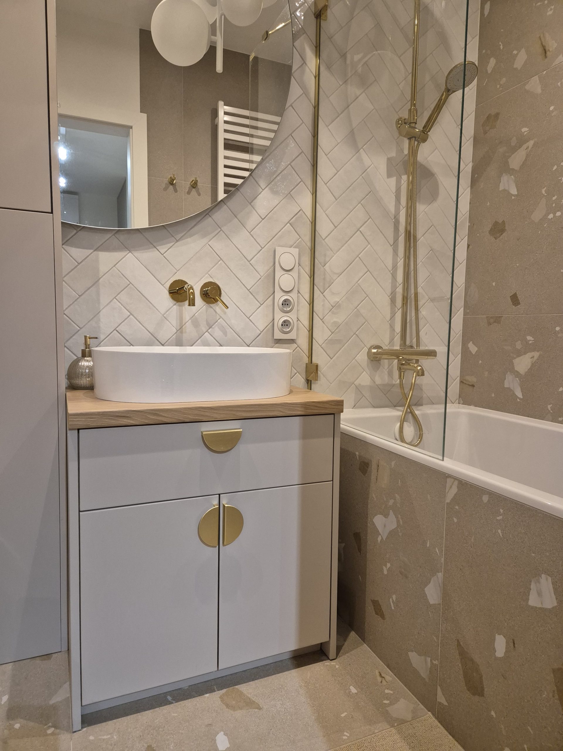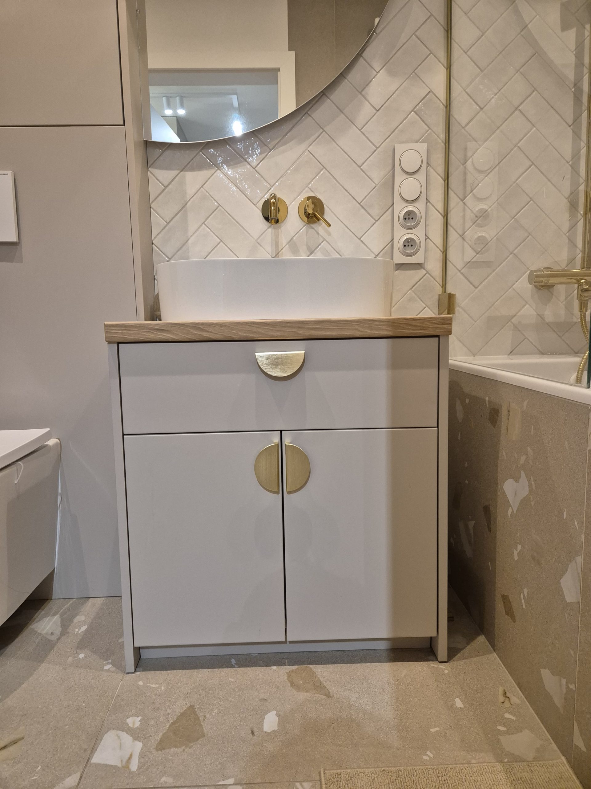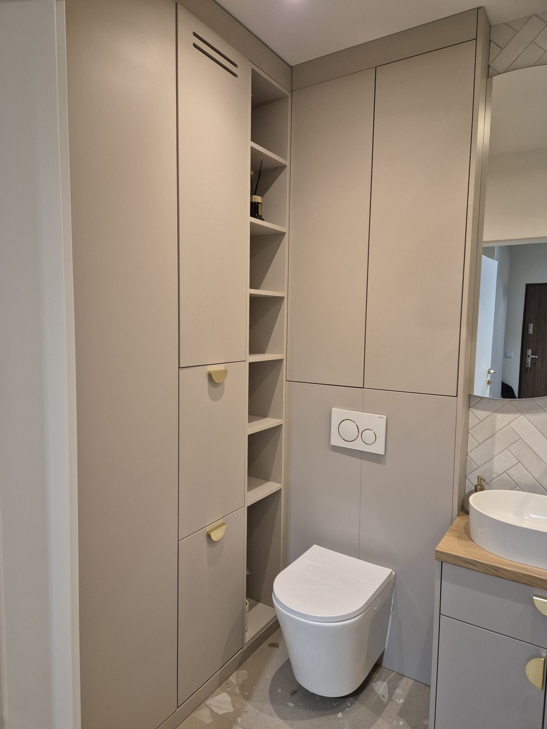 Łazienka wykonana w jasnych kolorach żeby wizualnie nie zmniejszać ograniczonej przestrzeni. Szafa po lewej pozwala maksymalnie wykorzystać powierzchnie. Całość dopełniają złote ucwhyty.