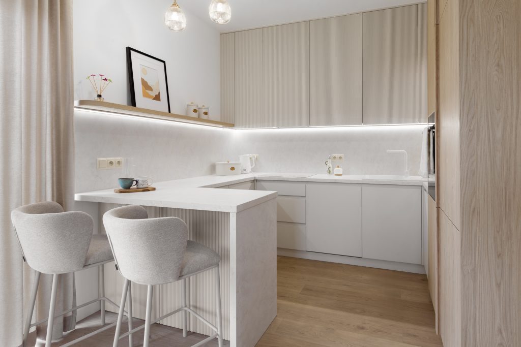 Piękne, przestronne wnętrza w całości zabudowane meblami od Moblera – Lakierowany mdf, laminowana płyta Dąb Casella i inne materiały w jasnych kolorach dają efekty jasnych, otwartych przestrzeni.